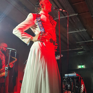 Playing a selection of old and new songs, Charles gets changed after a cover rendition of "Lapdance". Now dressed gloriously all in white, donning a shirt, suit jacket, and maxi skirt, he accessorises his look with a statement belt and blue braces. "That took a bit longer than I thought," he jokes before performing another new song, "Hearts on the run". The crowd adores him, which is evident, as they shout it in between songs and the atmosphere is electric, charged with fierce love and support for the tall man on stage.