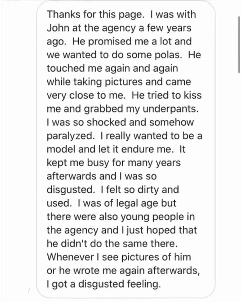 Back in 2015 J. Merlino, also known as J. Walker, texted me on Instagram. I was only 16 years old when he told me I would do great as a model in his agency, One Time Management. He invited me to his studio. The second time, he asked me to come alone. As I arrived, he told me to undress so he could make a couple of Polas, which were meant to be sent to different designers and brands. Instead of taking these photos of me in my underwear, he started touching me between my legs and kissed me on my back and cheeks. I even had to touch myself and show to him that “I love my body”. He was acting as if what we were doing was completely normal. He said, ”The best models in his agency are the ones that can express their sexiness. It’s completely normal to be touched. If you’re not okay with that, you will never be able to make it in this industry.” In the meantime, he started taking photos, which were never sent to any designers or brands. Whereas he tried to give me another kiss, I stood up and told him that I don’t feel well at all. J. got angry and ordered me to leave because I was a waste of time and not made for the model-industry.