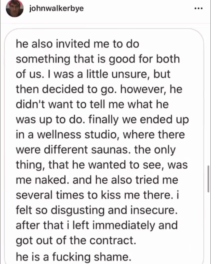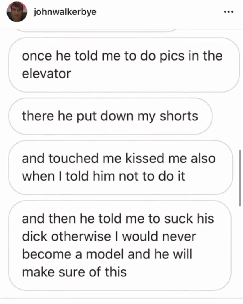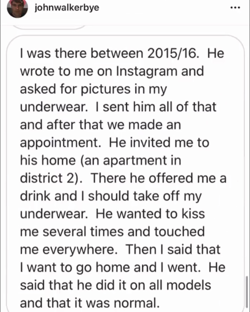 In the summer of 2017, at the age of 16, I was about to sign a contract with one of Switzerland's most recognised male modelling agencies, One Time Management. All of a sudden I found myself in a toxic cycle of sexual harassment and psychological abuse with the companies booker and owner J. Walker. It sickens me to see that I wasn't the only one experiencing this. People like him have to be taken the fuck down in this industry.