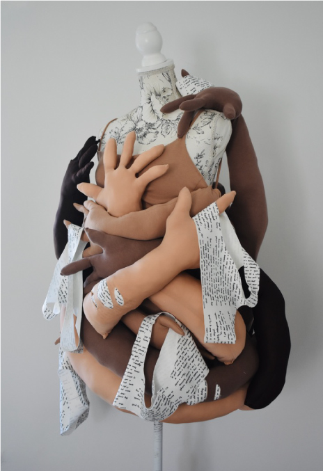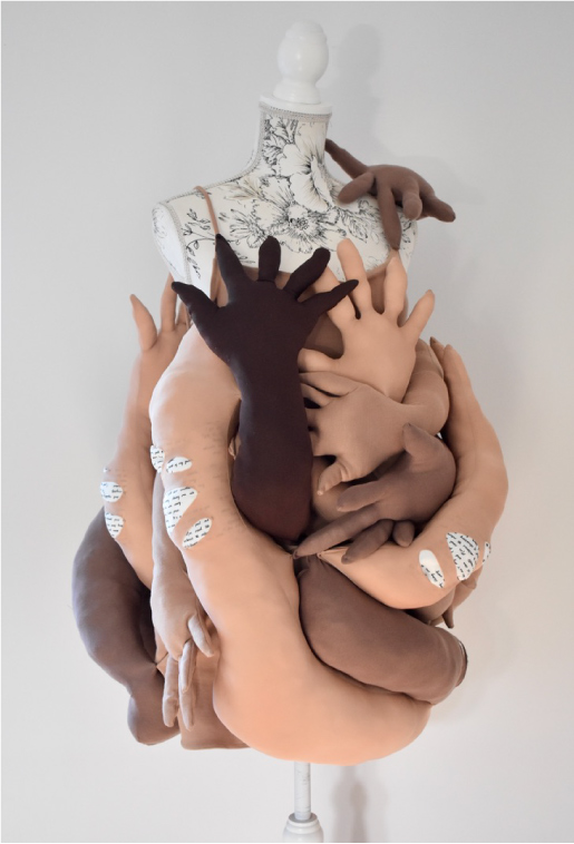 In my development stage, I made a design constructed of balloons which was visually inspired by Iris Van Herpen and Fredrik Tjarandsen; my final piece I was heavily inspired by this developmental stage. There are several websites available whereby individuals share their stories of sexual assault and I used these platforms and stories to inspire the many developmental pieces I created that can be seen on my blog. One story in particular, where a guy described his sexual assault experience as ‘being used as a sex doll’, was really impactful and shocking; the term ‘sex doll’ appeared in several of the stories and I instantly associated it with the inflatable sex dolls which is what inspired me to use balloons in this experimental piece. The black balloons used were supposed to evoke this idea of limbs entangling with one another, consuming the body. As balloons wouldn’t last, this design was developed to create a more three-dimensional piece that would be a more long-lasting design.